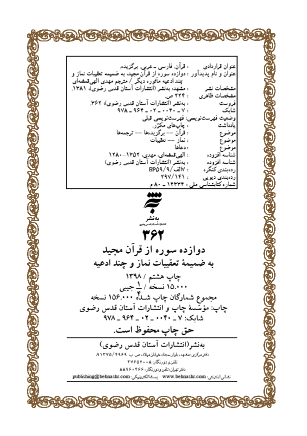 کتاب دوازده سوره از قرآن مجید شامل سوره های یس، الرحمن، ذاریات، واقعه، ملک، جمعه، نبأ، قدر، کافرون، اخلاص، فلق و ناس است. علاوه بر سوره های مذکور، تعقیبات مشترک و مخصوصه نمازهای یومیه و ادعیه روزهای هفته و دعای فرج امام زمان(عج) را نیز شامل می شود. سوره ها و ادعیه به ترجمه مرحوم الهی قمشه ای است.