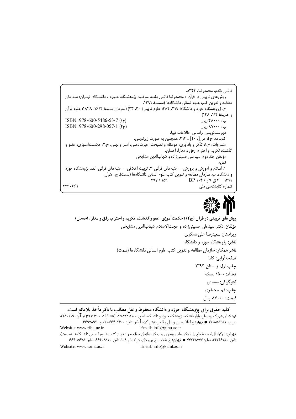 قرآن کریم کتاب تربیت است و معلم آن نیز خدای متعال و پیامبر‌اکرم (ص) هستند که به‌گفته خود پیامبر (ص) او به عنوان معلم برانگیخته شده است؛ «انّما بُعِثتُ مُعَلّّماً». در این کتاب از روش‌های مختلف تربیتی استفاده شده است که می‌تواند الگویی برای معلمان و مربیان در تربیت اسلامی باشد؛ چنان‌که به گفته قرآن، پیامبر برای مؤمنان اسوه و الگوی نیکوست؛ «لَقَدْ کَانَ لَکُمْ فِی رَسُولِ اللَّهِ أُسْوَهٌ حَسَنَهٌ…». از مجموعه کتاب‌های «روش‌های تربیتی قرآن کریم» کتاب حاضر است که به بررسی پنج روش از روش‌های تربیتی یعنی روش حکمت‌آموزی، عفو و گذشت، تکریم و احترام، رفق و مدارا و احسان از منظر قرآن‌کریم می‌پردازد. در بررسی هر یک از این روش‌ها ابتدا به مفهوم شناسی روش پرداخته شده و سپس مبانی روش، اصول و شیوه‌های اجرای آن، کارکردهای تربیتی روش و نیز در پایان به آسیب شناسی روش پرداخته شده است.