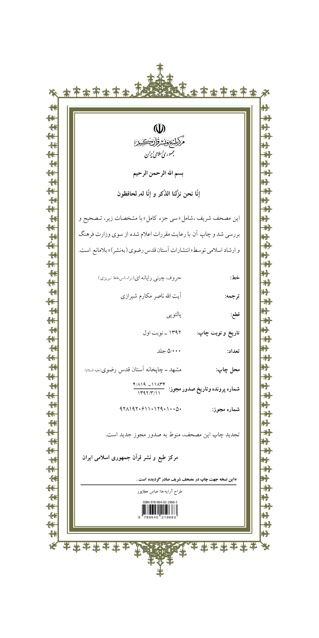 مصحف شریف قرآن به خط نسخ ایرانی که بر اساس خط استاد احمد نی ریزی توسط مرکز طبع و نشر قرآن کریم آماده شده، به صورت 15 سطر و ختم به آیه و ترجمه آیت الله مکارم شیرازی عرضه شده است. ویژگی اصلی این مصحف کم اعراب بودن آن است. مبنای اعراب گذاری کلمات در این مصحف، صحت و سهولت بیشتر قرائت قرآن بوده و در حد ضرورت از علامت هایی استفاده شده است.