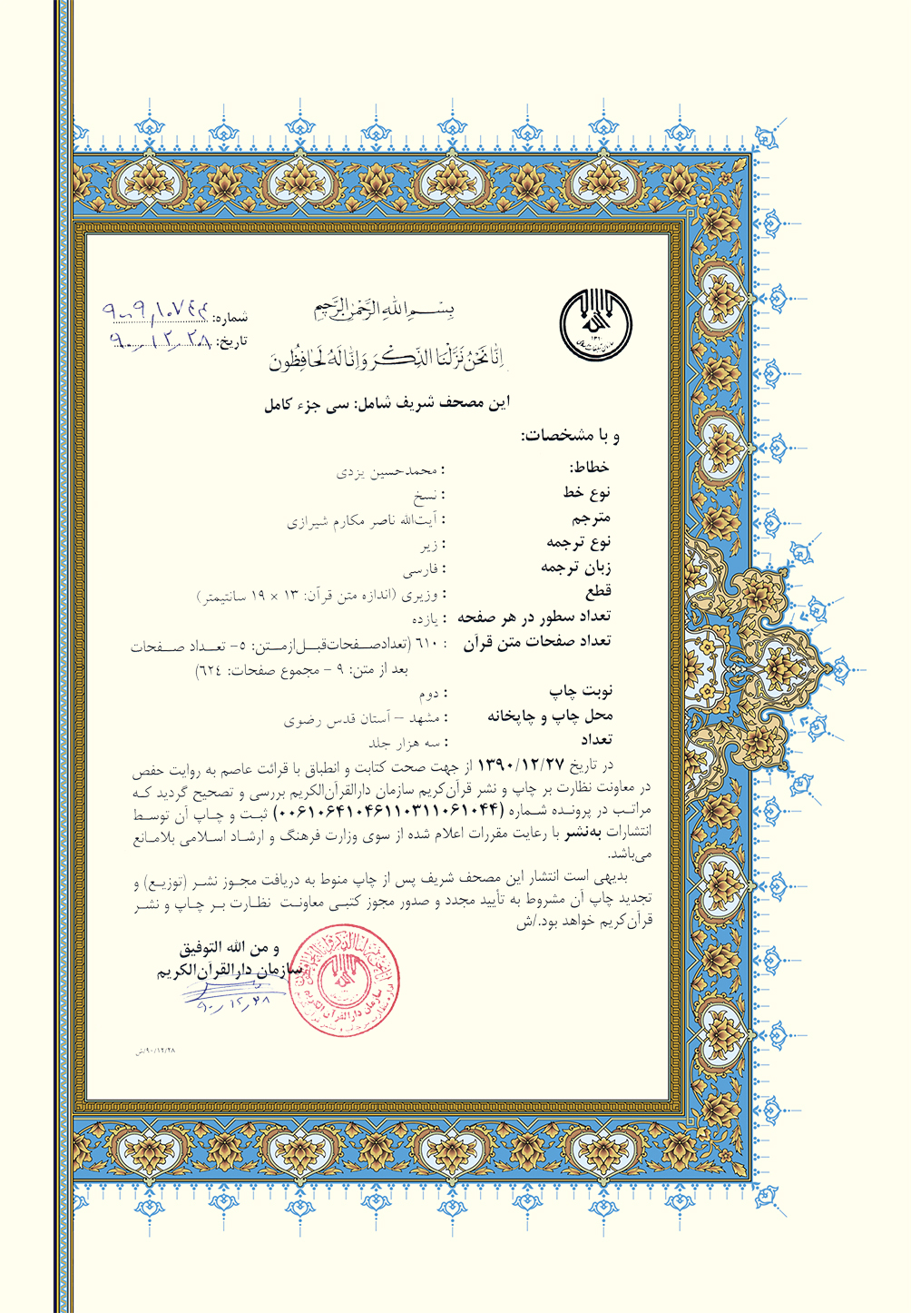 مصحف شریف قران به خط یزدی به صورت 11سطر و با ترجمه آیت الله مکارم شیرازی و تذهیب استاد نامور عرضه شده است.