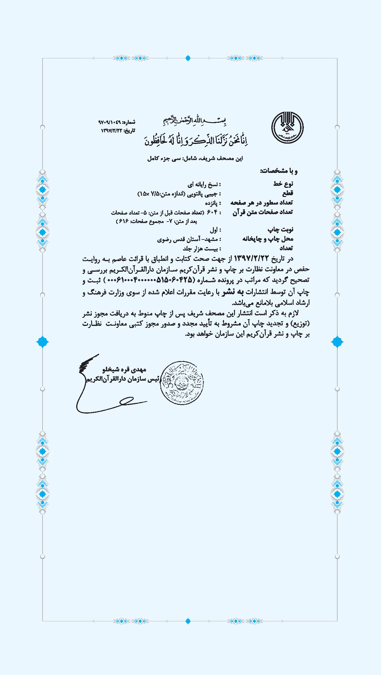 قرآن کریم 15سطر عثمان طه بدون ترجمه که در قطع پالتویی ویژه استفاده عموم زائران و مجاوران عرب زبان حرم مطهر علی بن موسی الرضا(ع) ارائه می شود.