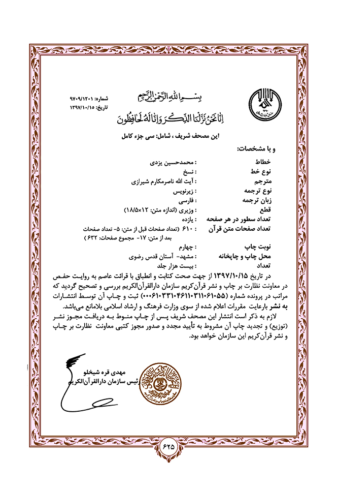 قرآن کریم به خط مرحوم حسین یزدی که به صورت 11سطر و با ترجمه روان آیت الله مکارم شیرازی در دو قطع وزیری ورحلی عرضه شده است. این مصحف شریف به صورت ویژه در حرم مطهر علی بن موسی الرضا(ع) ارائه می شود.