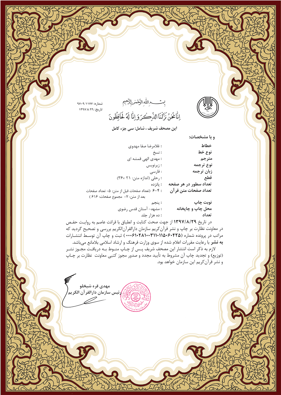 مصحف شریف قرآن به کتابت استاد غلامرضا صفامهدوی(15سطر) | سامانه بازنمای دستاوردهای قرآنی