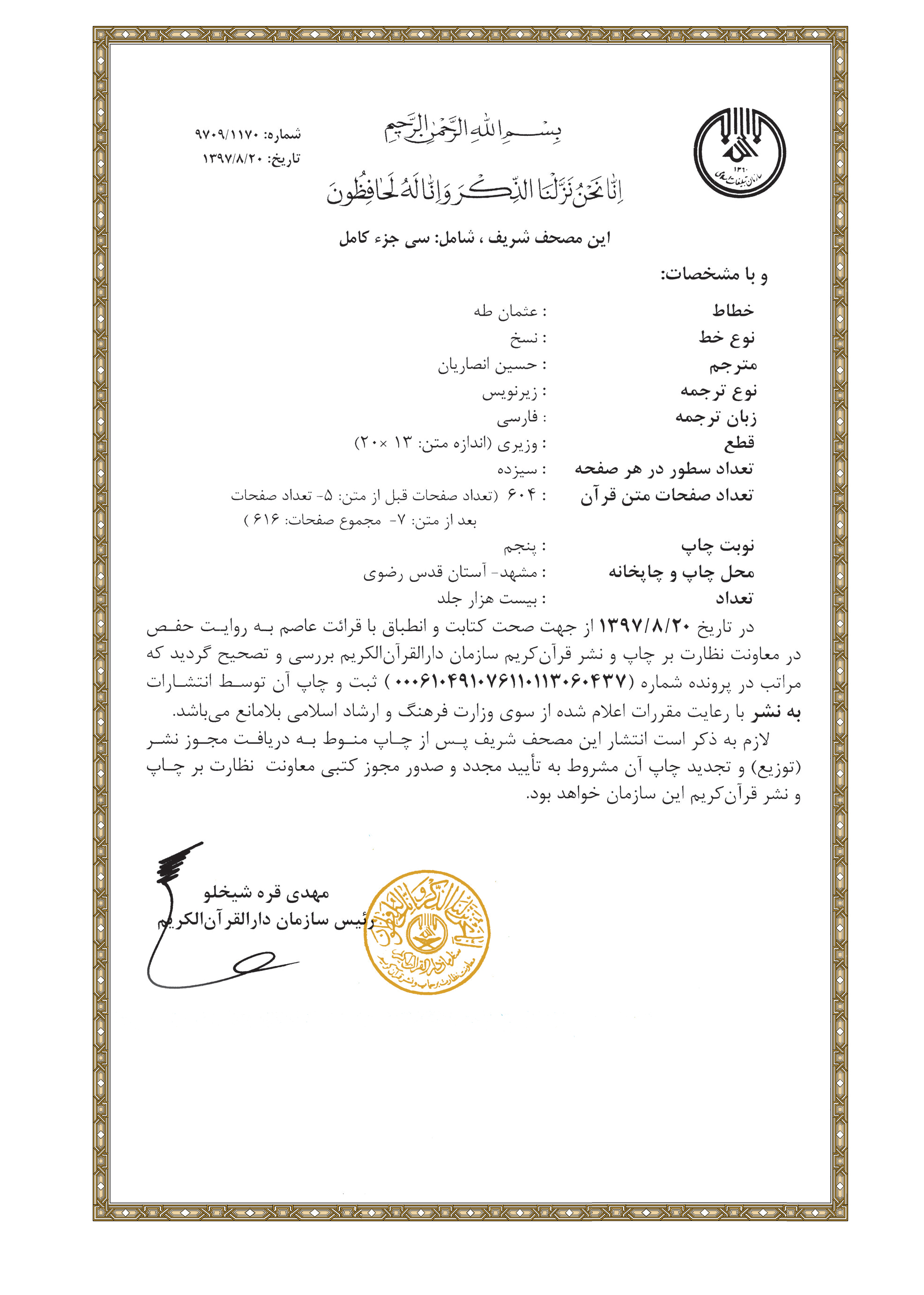 مصحف شریف قرآن ترجمه استاد حسین انصاریان | سامانه بازنمای دستاوردهای قرآنی