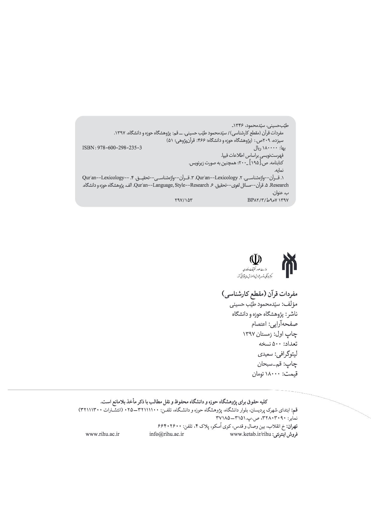 یکی از دانشهای مهم و زیربنایی برای فهم قرآن دانش واژه شناسی یا مفردات قرآن است. در کتاب حاضر با بهره گیری از منابع اصیل و معتبر لغت، کتب مفردات و تفاسیر به صورت کاربردی مهمترین مسائل ناظر به تفسیر کلمات قران را به بحث گذاشته و با تحلیل و تبیین معنای دهها کلمه قرآنی مراحل شرح واژه های قرآن را به صورت عملی به دانشجو آموزش می دهد. در شرح معنای کلمات تلاش شده تا آنجا که ممکن است به کاربردهای کلمه در فرهنگ عرب توجه شود. اصلیترن هدف کتاب، آشنایی دانشجو با تعداد قابل توجهی از کلمات قرآن، آشنایی عملی با مهمترین منابع مفرداتی فارسی و عربی قرآن، و آشنایی دانشجویان با نقش فرهنگ عرب و سیاق در شرح کلمات قرآن است. هدف دیگر درک عمیق دانشجو نسبت به ناروایی تفسیر کلمات قرآن به معانی مرتکز در ذهن و مشهور آنهاست.