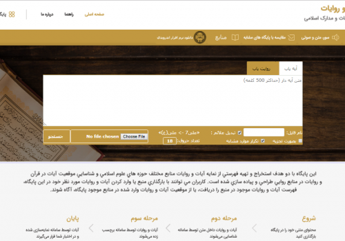 این پایگاه با دو هدف استخراج و تهیه فهرستی از نمایه آیات و روایات منابع مختلف حوزه های علوم اسلامی و شناسایی موقعیت آیات در قرآن و روایات در مناغبع روایی طراحی و پیاده سازی شده است.