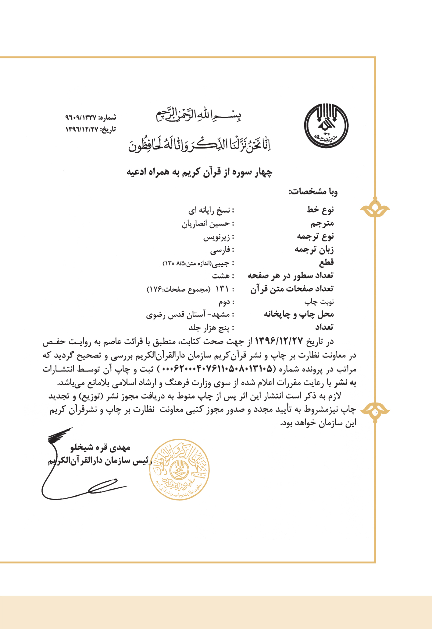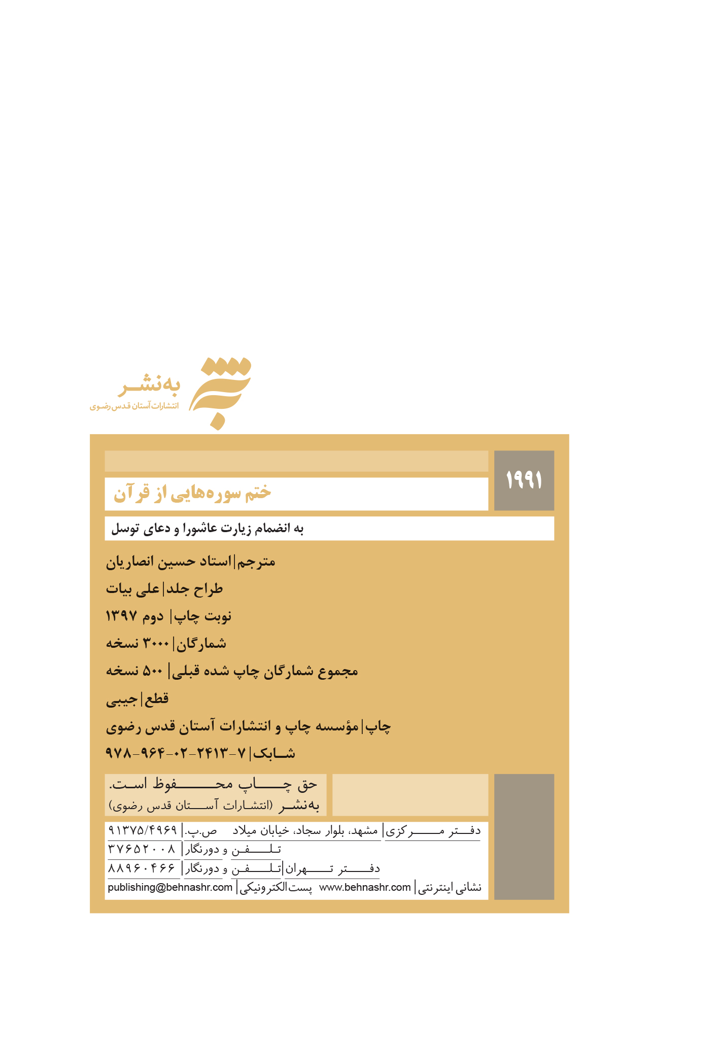 مقدمه اثر موضوع و صحت روایی ختم سوره ها و طرق آن را کاملاتوضیح داده، در ابتدای هر سوره با استناد به منابع روایی نحوه ختم سوره ها آورده شده است. پس از نحوه ختم سوره، متن سوره آورده شده است. این اثر دارای سوره های انعام، یس، الرحمن، واقعه و آیت الکرسی است که به صورت ترجمه زیر، از ترجمه استاد حسین انصاریان بهره برده شده است. پس از اتمام سوره ها زیارات عاشورا و دعای توسل آورده شده است.