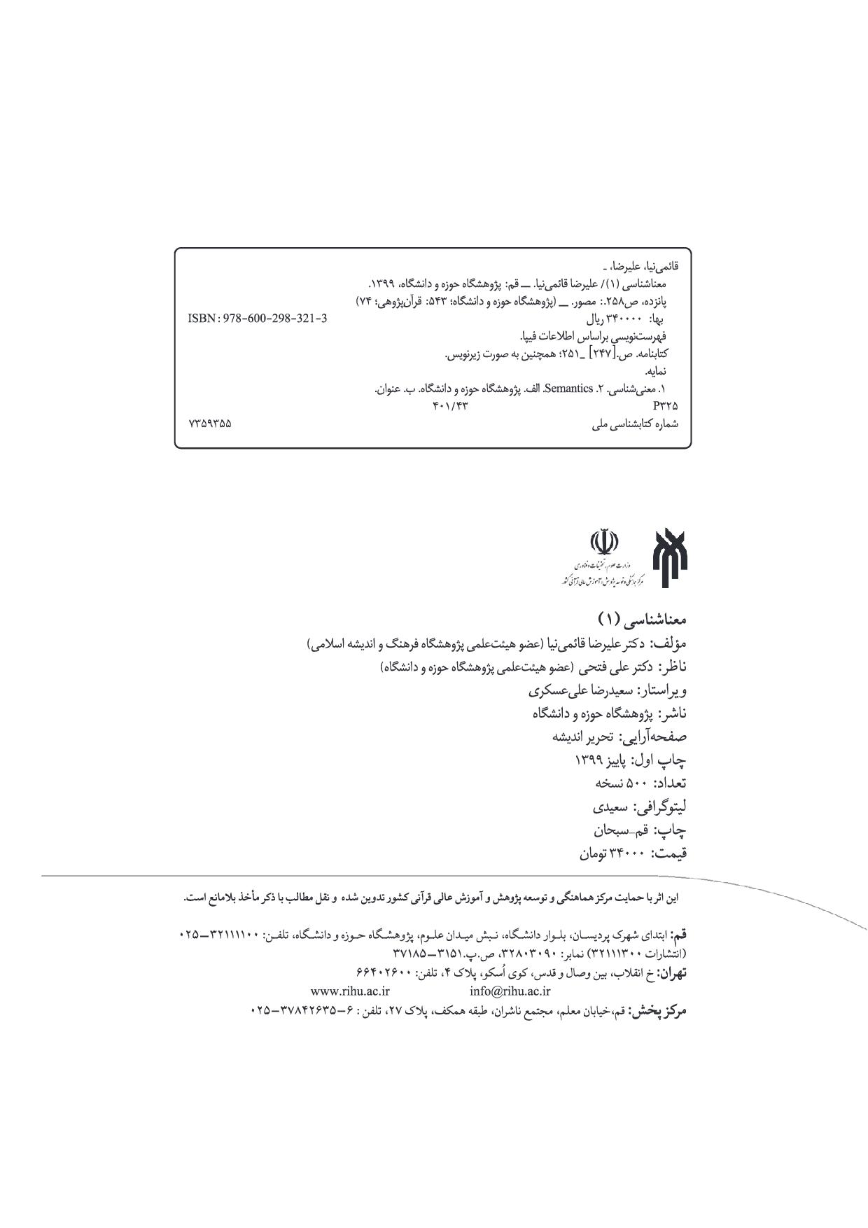 معناشناسی زبانی یکی از شاخههای مهم زبانشناسی است که از قرن بیستم به صورت مستقل مطرح شده است. این دانش به بررسی علمی معنا میپردازد و از اینرو، «دانش معنا» نام گرفته است. اگر چه قدمت مباحث آن به دوره یونان میرسد و در میراث علمی مسلمانان و در علوم مختلف اسلامی مطرح بوده، اما تدوین و طرح این دانش در عصر جدید تفاوتهای مهمی با دوران گذشته دارد. نظاممندی و روشمندی و ابتنا بر مبانی زبانشناختی خاص، چهره جدیدی به آن داده است. همچنین، این دانش تأثیر فراوانی در مطالعات دینی و فهم و بررسی متون دینی بر جای گذاشته است. در چند دهة اخیر، تحقیقات معناشناختی گستردهای بر اساس جریان ها و روشهای معناشناختی در مطالعات قرآنی انجام شده است. کتاب حاضر برای آشنایی با مبانی و روشهای این دانش تدوین شده است. این اثر براساس سرفصل مصوب و با حمایت مرکز هماهنگی و توسعه پژوهش و آموزش عالی قرآنی کشور تدوین و به عنوان منبع آموزشی درس معناشناسی1 رشته علوم قرآن و حدیث معرفی شدهاست.