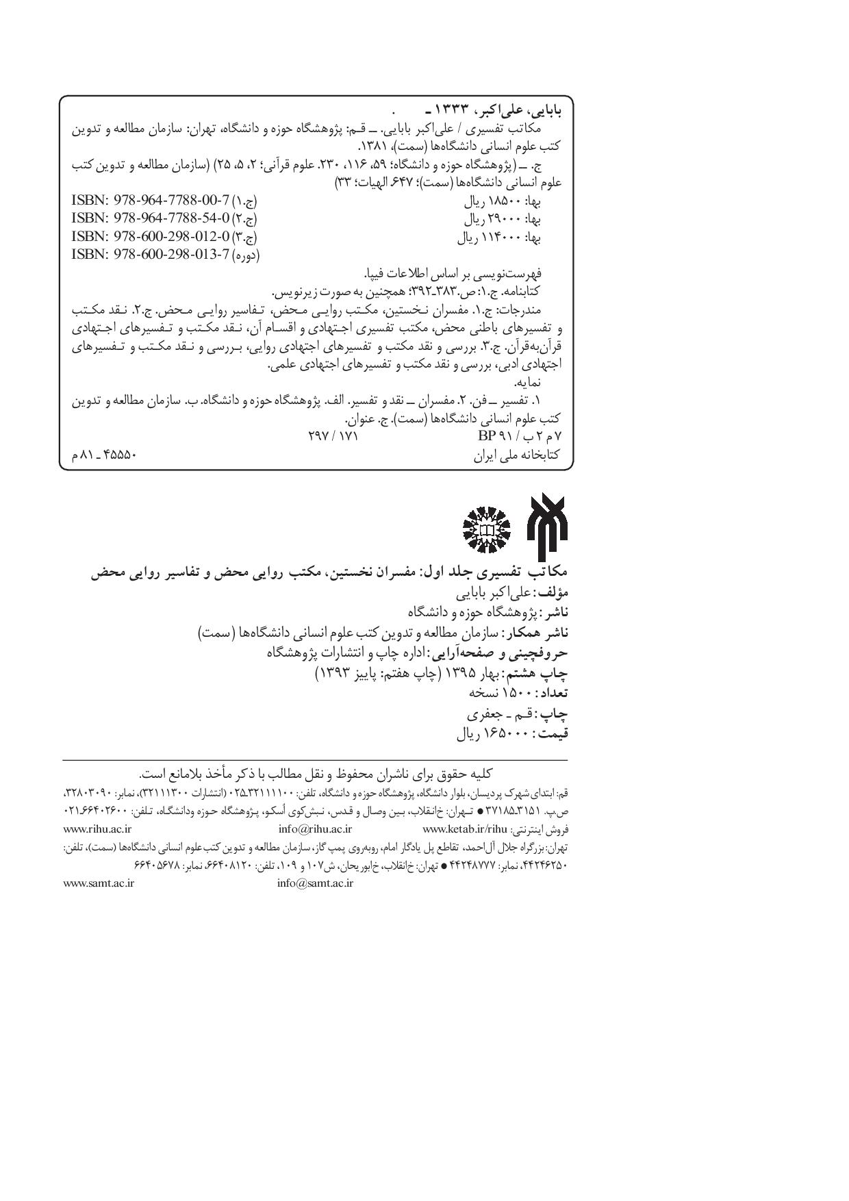 طرح مکاتب تفسیری در سه جلد، عهدهدار نقد مکاتب تفسیری و کتابهای تفسیر است. مطالب این مجموعه سه جلدی در یک مقدمه و دو بخش ارائه میشود. جلد اول کتاب شامل مقدمه، بخش اول و فصل اول بخش دوم است. در مقدمه، مفهومشناسی اصطلاحات، دستهبندی مفسران و تفاسیر قرآن بررسی میشود. بخش اول که مفسران نخستین نام دارد، در سه فصل تنظیم شده است: فصل اول به مفسران آگاه به تمامی معانی قرآن (پیامبر(ص) و امامان معصوم(ع)) و فصل دوم و سوم به مفسران آگاه به بخشی از معانی قرآن (مفسران صحابی و تابعی) میپردازد. بخش دوم با عنوان مکاتب تفسیری و تفاسیر در ده فصل ارائه شده است. فصل اول آن، در این کتاب آمده و در آن مکتب تفسیری روایی محض معرفی و ادله طرفداران آن، از آیات و روایات، کاویده شده است. تفاسیر این مکتب، نیز به دو دسته «تفاسیر اصلی» و «جوامع تفسیری» تقسیم میشوند. از جمله مطالب، بررسی تفاوت اساسی تفاسیر روایی اهل سنت و تفاسیر روایی شیعه و کاستیهای مشترک آنهاست. از بحثهای دیگر، بررسی قوت و ضعف تفاسیر روایی اهلسنت، مانند: کتاب التفسیر بخاری، تفسیر القرآن العظیم ابنابیحاتم رازی، الدرالمنثور سیوطی و نیز تفاسیر روایی شیعه، مانند: تفسیر عیاشی، تفسیر فرات کوفی، تفسیر برهان و تفسیر نورالثقلین است.