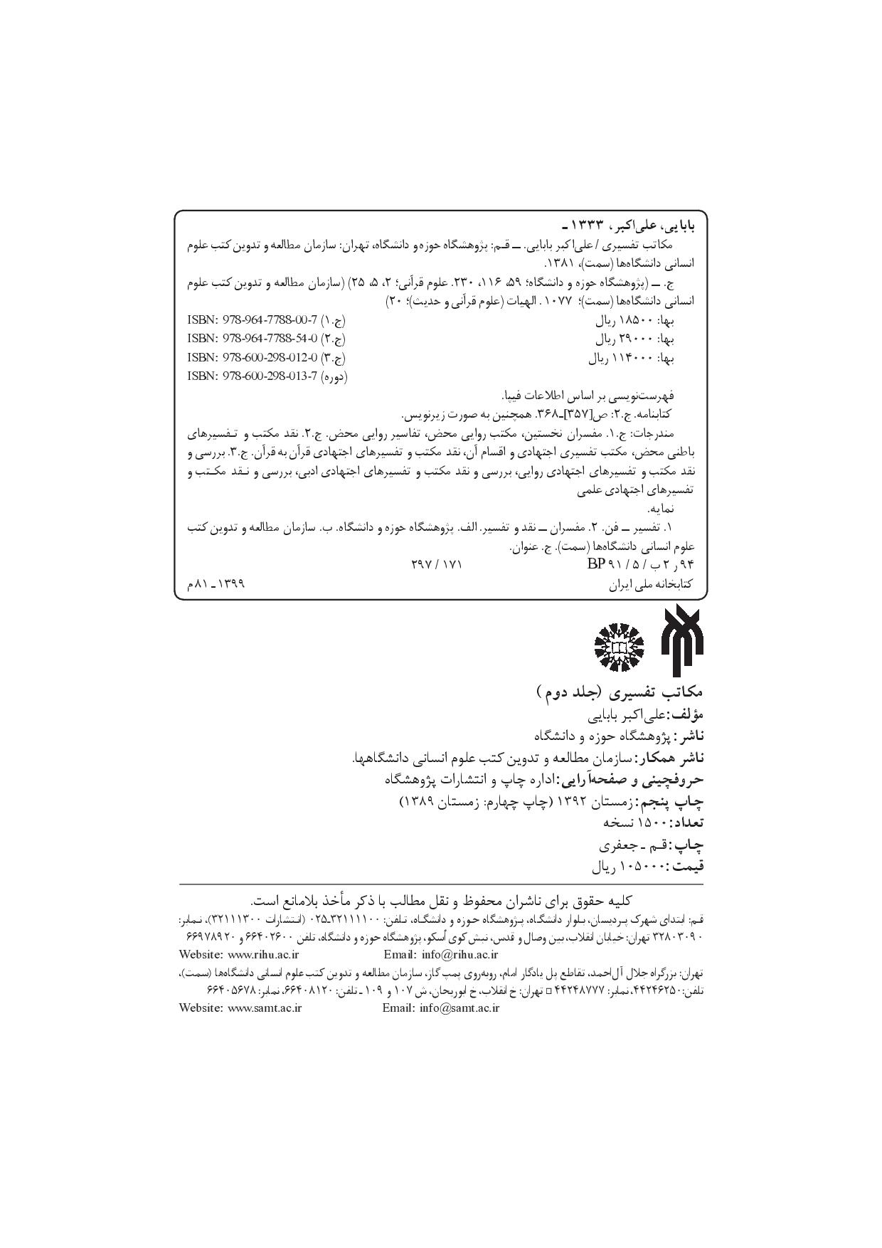 این اثر که جلد دوم از مجموعه سه جلدی مکاتب تفسیری است فصلهای دوم، سوم و چهارم بخش دوم کتاب را در بردارد و به مباحث ذیل میپردازد. فصل دوم: نقد و بررسی مکتب تفسیری باطنی محض، بیان ماهیت باطن قرآن و معیار صحت تفسیر باطنی، بررسی و ارزیابی شماری از تفسیرهای باطنی محض؛ فصل سوم: معرفی مکتب تفسیری اجتهادی، بررسی دلائل مخالفان و موافقان و اشاره به اقسام آن؛ فصل چهارم: نقد و بررسی مکتب اجتهادی قرآن به قرآن در قالب سه نظریه و ارزیابی تفسیرهای «المیزان فی تفسیرالقرآن» و «اضواء البیان» از تفسیرهای معروف این مکتب.