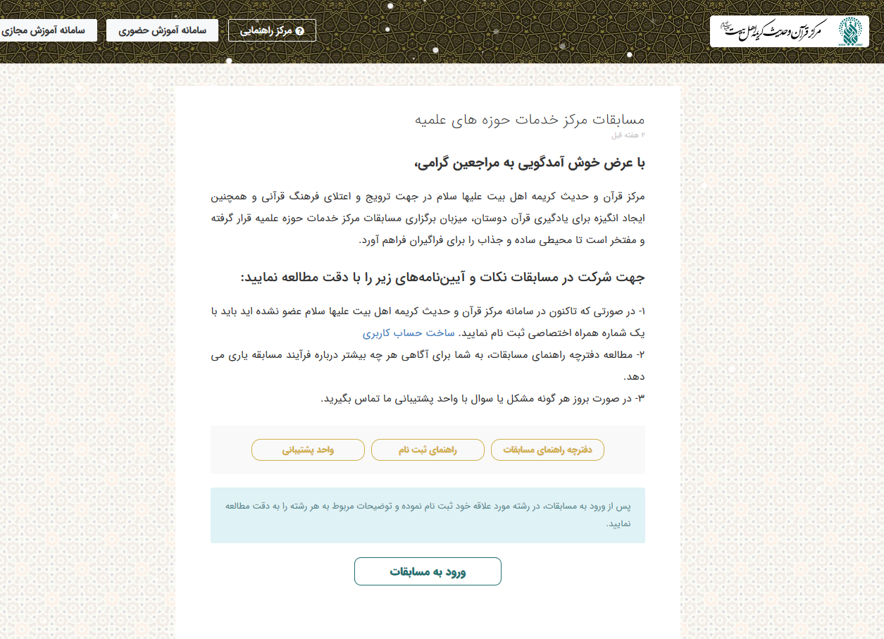 متقاضیان میتوانند برای ثبتنام از تاریخ 16 مهر تا 10 آبان 1399 به «سامانه سخا/ خانواده و امور فرهنگی/ بخش مسابقات قرآن» (ویژه همسر و فرزندان طلاب برادرو طلاب خواهر) و سایت جامعهالمصطفی (ویژه طلاب غیر ایرانی) مراجعه نمایند.