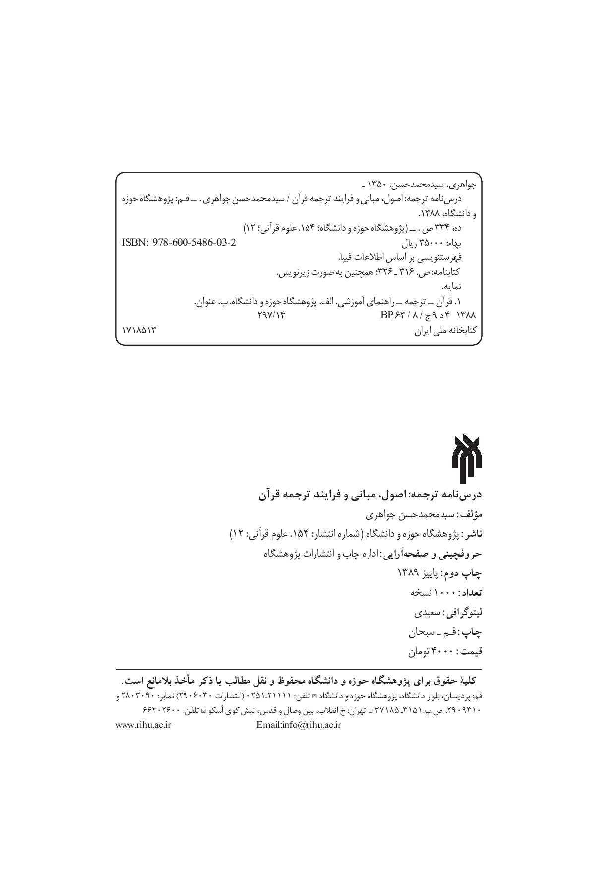 درسنامه‌ ترجمه که در واقع روش‌شناسی ترجمه است، روش‌ها و ظرایف زبانی ترجمه را به بحث می‌گذارد و با بررسی اصول، مبانی و فرایند ترجمه قرآن، حرکت مترجم از زبان مبدأ به زبان مقصد را بازسازی کرده و به تصویر می‌کشد. در این کتاب، برخی مباحث فرعی و دخیل در حوزه ترجمه مورد توجه بوده و هرچند محور اصلی آن به مهم‌ترین متن حساس، یعنی قرآن کریم، اختصاص یافته، به متون دیگر و نیازهای ترجمه و آنها نیز نظر دارد. افزون بر این، تلاش کرده تا حد مجال، مباحث با دیدی جامع نگریسته شود. نوشتار حاضر به منظور تأمین متن آموزشی مقاطع تخصصی مربوط تدوین یافته و با ارائه بسترهای پژوهشی و خودآزمایی، زمینه فعالیت علمی و دانش‌پژوهان را فراهم آورده است.