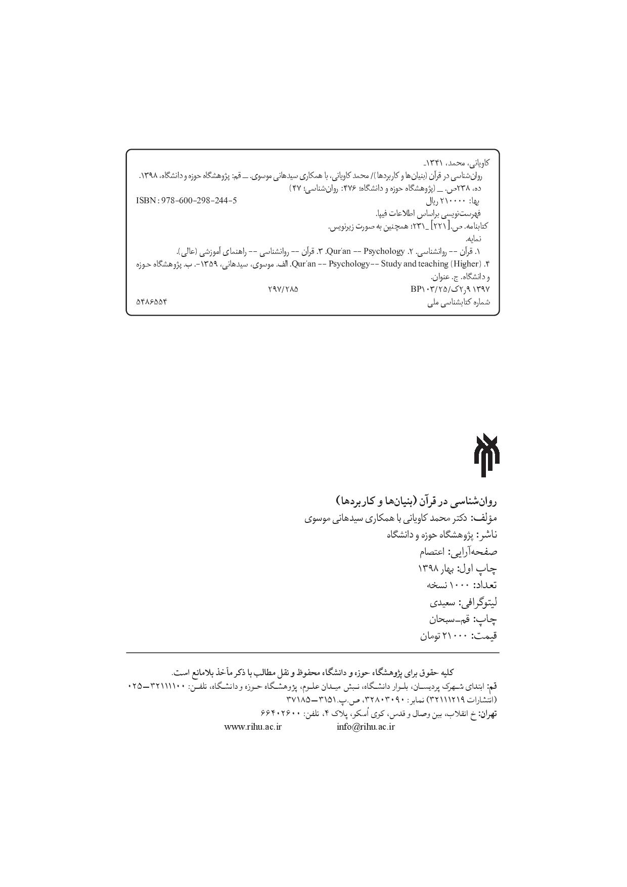 کتابی حاضر، در کنار کتاب «روانشناسی در قرآن، مفاهیم و موزه ها» هویت کامل تر خود را می یابد؛ در فصول نه گانه آن کتاب، به تعدادی از مباحث روانشناسی، مثل احساس و ادراک، رشد، انگیزش، اجتماعی، سلامت روانی و روانشناسی مثبت، با رویکرد قرآنی، به تفصیل پرداخته شد. در فصول هفت گانه این کتاب نیز به مباحثی مثل «عواطف و هیجانات»، «یادگیری و تغییر رفتار»، «ناخودآگاه»، «شخصیت، مباحث بنیادین»، «شخصیت، مباحث کاربردی»، «سنجش روانشناختی»، و «روانشناسی تفاوت ها» پرداخته شده است. اگرچه به تناسب فضای دانشجوئی و اخذ بازخورد از کتاب اول، از حجم و تعداد آیات در این کتاب کاسته شده است، لکن رویکرد کلی حاکم بر این دو کتاب، رویکرد قرآنی است؛ بدیهی است که معرفی چارچوب ها و اسکلت اولیه «روانشناسی قرآنی» به عنوان یک مکتب روانشناختی، و تعیین مسیر پژوهش ها و آموزش های لازم، در دو کتاب کم حجم، آنهم با ملاحظات دانشجوئی، ممکن نیست، لکن اینها قدم های اولیه ای است که در کنار تلاش های بسیار ارزشمند محققان و مولفان دیگر، در این مسیر برداشته می شود.