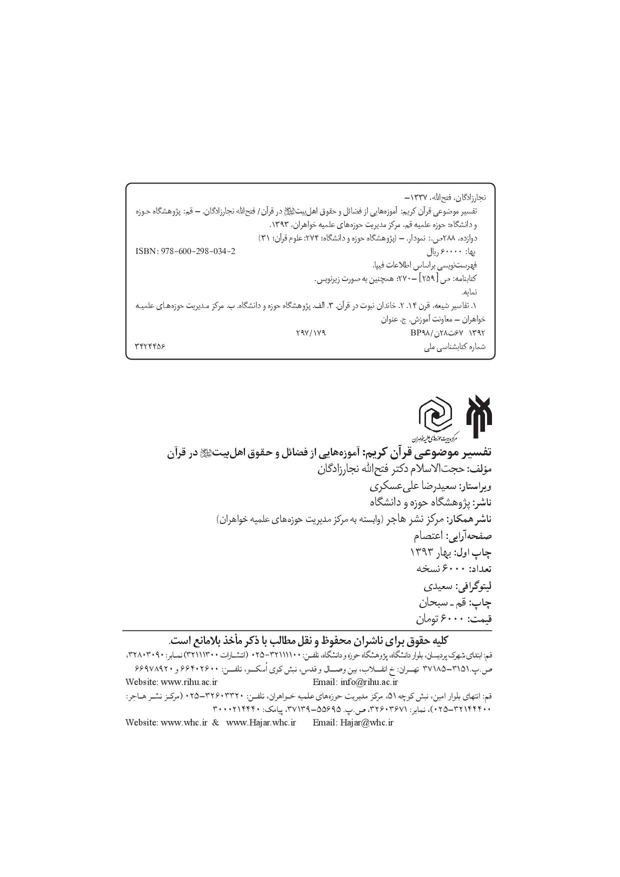 اهـلبیت پیامبر اکـرم(ص) در قـرآن کریم جایگاهی ممتاز دارند. مفاهیمی چـون «اهلالبیت» (احزاب، ۳۳)، «اهل الذکر» (نحل، ۴۳؛ انبیا، ۷)، «ذی القربی» (انفال، ۴۱؛ حشر، ۷)، «اولی الامر» (نساء، ۵۹)، «اوتو العلم» (عنکبوت، ۴۹)، «من عنده علم الکتاب» (رعد، ۴۳)، «صادقین» (توبه، ۱۱۹) «الذین اصطفینا من عبادنـا» (فاطر، ۳۲) و ... هر یک شأنی از شئون آنان را در سطح ظاهری قرآن گواهی میدهند که فارغ از بُعد باطنی قرآن قابل توجهند. کتاب حاضر تعدادی از آیات موجود در این زمینه را گزینش کرده و با دستهبندی آنها در دو قلمرو فضائل و حقوق اهلبیت(ع) کوشیده است مفاد آنها را با توجه به قرائن درون متن و برون متن (مبتنی بر روایات فریقین) به صورت نظاممند و منسجم شرح دهد و به شبهات پاسخ گوید. از جمله فضائل اهلبیت(ع)، فضیلت تطهیر و همتایی با کتاب خدا و از جمله حقوق آنان، حق معرفت، ولایت، اطاعت، مودت و وراثت زمین است که در این اثر مورد بررسی قرار گرفته است.