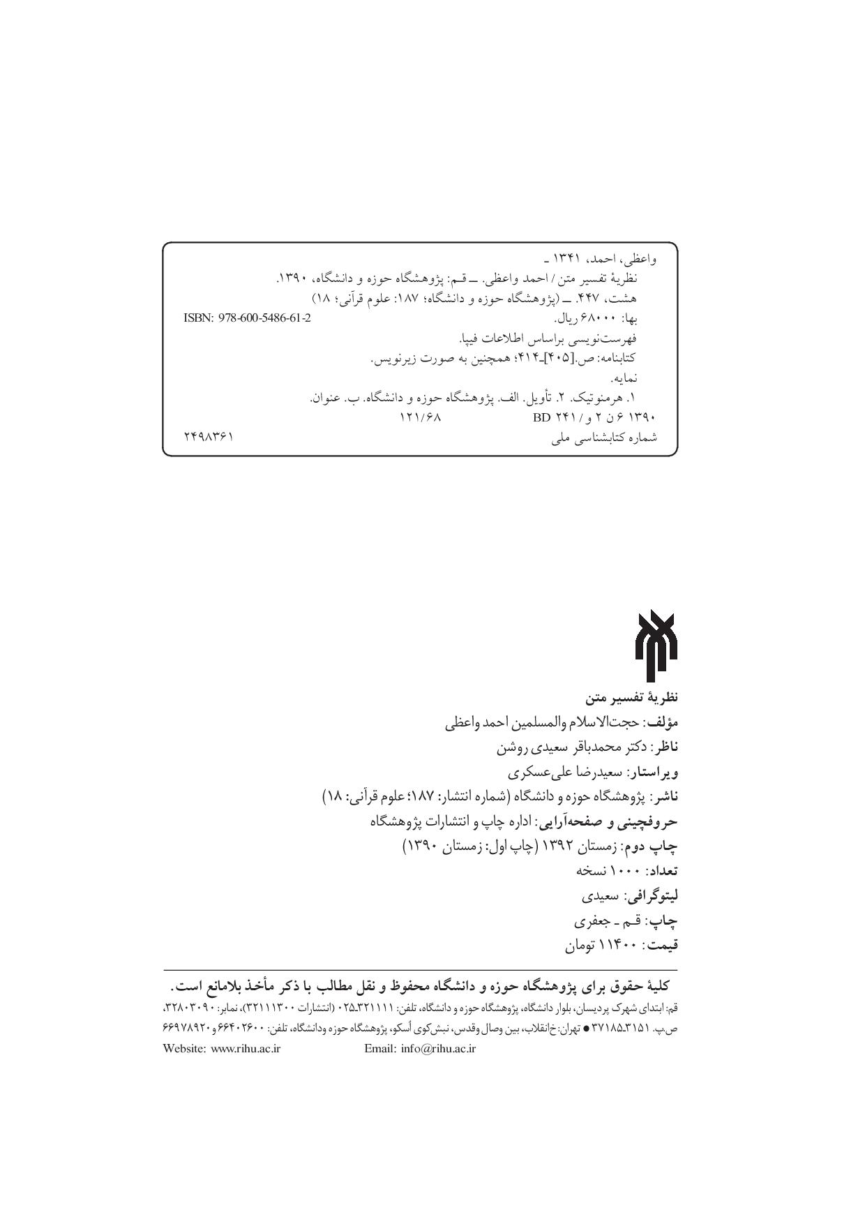 از دهههای نخست قرن بیستم به اینسو، شاهد بروز دیدگاههایی درباره زبان، فهم، تفسیر و سازوکار حصول فهم متون هستیم که در تقابل جدی با تلقیهای مقبول نزد عالمان مسلمان است. تقابل مزبور، طبعاً تردیدها، پرسشها و شبهاتی را درباره اعتبار رویکرد تفسیری متداول پدید میآورد و ضوررت تنقیح نظریهای جامع درباره مباحث بنیادین فهم و تفسیر متن را پیش روی عالمان مسلمان مینهد. مکتوب حاضر در کنار تأمین هدف فوق و پرداختن به اهم چالشهای معاصر در حوزه تفسیر متن، بر آن است که با نگاه دانشمحور افق جدیدی در قلمرو تأملات تفسیری بگشاید. نگارنده در این اثر پرسشهای اساسی «نظریه تفسیر» را در سه محور اصلی «هستیشناسی معنا»، «معرفتشناسی معنا» و «اخلاقیات معنا و تفسیر» طبقهبندی کرده است. با توجه به تقسیم فوق کتاب حاضر در چهار فصل صورتبندی شده است. در فصل نخست به تبیین مراد از «نظریه تفسیر متن» پرداخته، به اهم مسائل آن اشاره شده و نسبت آن با دیگر مصطلحات حوزه تفسیر نظیر روش تفسیری، مبانی تفسیر، مناهج تفسیری بررسی میشود. در فصل دوم ضمن بحث درباره چیستی معنا، از اموری نظیر تعیّن و عدم تعیّن معنا، معانی طولی و عرضی، بحث خواهد شد. در فصل سوم که حجیمترین فصل کتاب است ابتدا، نظریههای تفسیری مشهور معاصر، «هرمنوتیک فلسفی»، «ساختارگرایی»، «نوپراگماتیسم» و «شالودهشکنی» به بحث گذاشته میشود. و سپس نقش چهار عامل اصلی یعنی مؤلف، خواننده، متن و زمینه (context) در امر فهم متن مورد بررسی قرار میگیرد. فصل چهارم این مجموعه به اخلاقیات معنا و الزامات تفسیر اختصاص یافته است. گرچه همت اصلی نگارنده معطوف به ارائه نظریهای جامع در تفسیر متن مبتنی بر مبانی اسلامی بوده است اما آرا و نظریههای تفسیری رقیب را از نظر دور نداشته و در مسائل مطروحه ضمن بیان نظریه مختار، دیدگاه آنان را نقد کرده است.