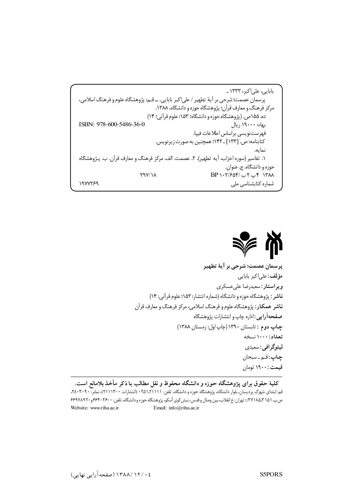 یکی از معـارف مهم قـرآن که اعتقـاد به آن نقش برجسـته و فـراگیری در هدایت و سـعادت انسان دارد، عصمت اهلبیت پیامبر(ص) است که در آیـه تطهیر بیان شده است. ولی شبهه افکنیهای برخی مخالفان موجب غبار آلود شـدن فضای فهم مفاد آیـه شده و پرسشهـایی را پیرامـون آن پدیدآورده است. این کتـاب در یک مقدمه و شش فصل برای رفع غبار از فضای فهم آیه به پنجاه و هشت پرسش، پاسخ مستدل داده و دلالت آیـه را بر ابعـاد گسترده عصمت پیامبر(ص) و اهلبیت آن بزرگوار تبیین کرده است.